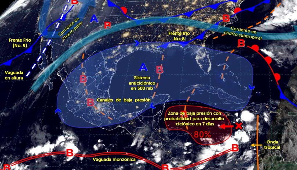 Según la Comisión Nacional del Agua (Conagua), canales de baja presión en la Península de Yucatán, el sureste y occidente del país, sumados a la humedad del océano Pacífico y el golfo de México, ocasionarán lluvias y chubascos en esas regiones, así como en el oriente y sur, con lluvias intensas en Jalisco, Chiapas y Quintana Roo.