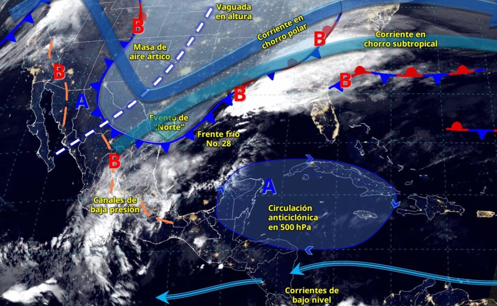 El frente frío No. 28 se desplazará sobre el litoral del golfo de México e interaccionará con un canal de baja presión que se extenderá sobre la península de Yucatán, originando lluvias y chubascos en el noreste y centro del país, lluvias fuertes a muy fuertes en zonas del oriente de México y península de Yucatán, así como lluvias puntuales intensas en Puebla, Veracruz, Tabasco, Oaxaca y Chiapas.
