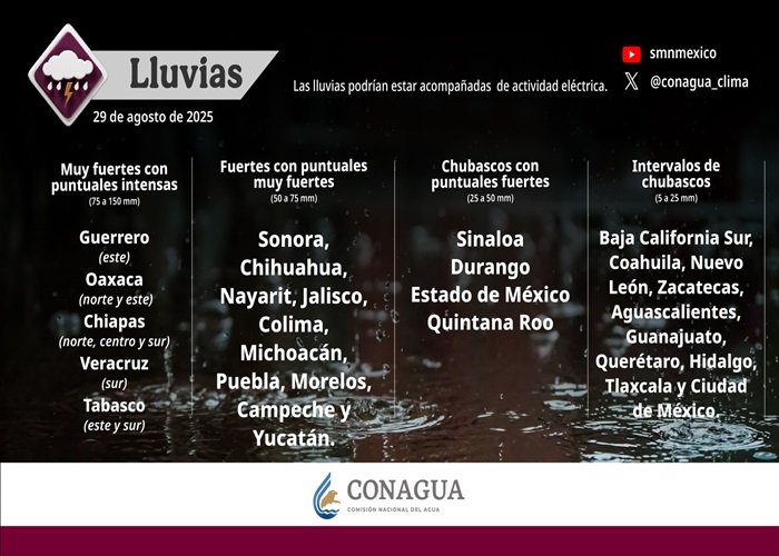 El Servicio Meteorológico Nacional (SMN) informó que en las próximas horas se presentarán lluvias muy fuertes a intensas en Veracruz, Guerrero, Oaxaca, Chiapas y Tabasco.