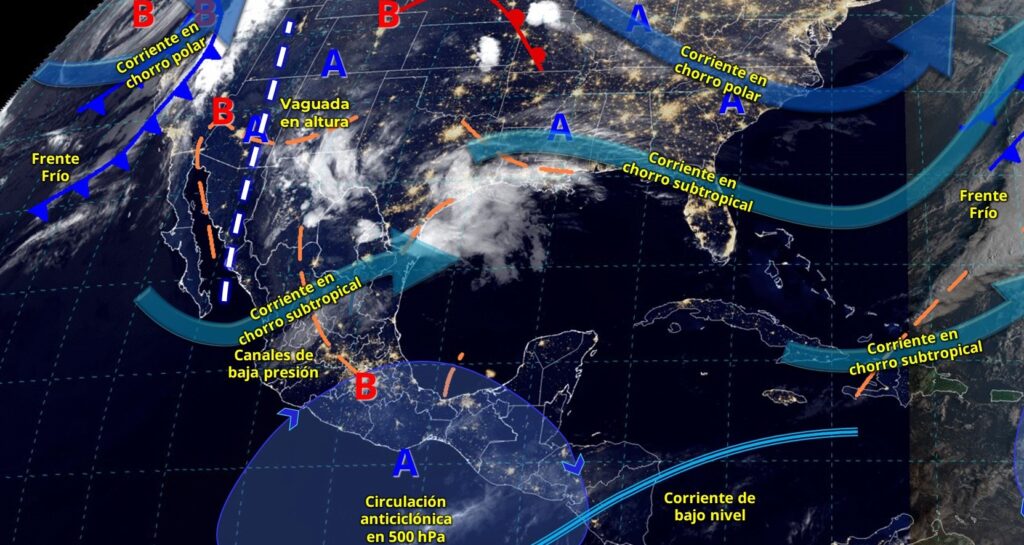 Canales de baja presión sobre el norte y noreste del país, una vaguada en altura y un frente estacionario sobre el noreste de México, ocasionarán chubascos y lluvias fuertes en ambas regiones, así como lluvias puntuales intensas en Coahuila, Nuevo León y Tamaulipas; las cuales podrían generar encharcamientos, crecida de ríos, deslaves e inundaciones.