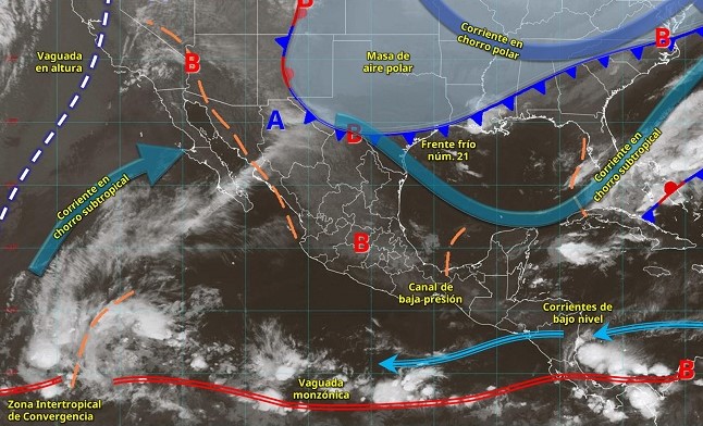 Asimismo, la masa de aire polar asociada a este sistema ocasionará un descenso en las temperaturas en regiones del norte, noreste, centro, oriente y sureste del país.