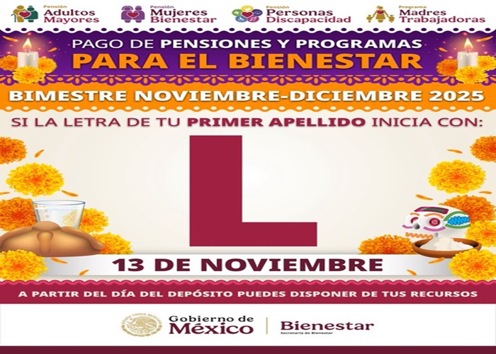 La Pensión del Bienestar continúa sus pagos correspondientes al último bimestre de 2025, y este jueves 13 de noviembre será el turno de las personas cuyo apellido inicia con la letra L, según el calendario oficial difundido por la Secretaría del Bienestar.