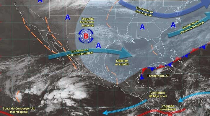 Por otro lado, la segunda tormenta invernal de la temporada continuará generando condiciones para la caída de nieve o aguanieve en Chihuahua, así como lluvia engelante en zonas serranas de Coahuila, Nuevo León, Durango y Zacatecas. Al finalizar el día, el sistema se desplazará gradualmente hacia el sur de Estados Unidos, dejando de influir en el territorio nacional.