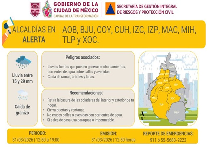 Autoridades de la Secretaría de Gestión Integral de Riesgos y Protección Civil activaron la Alerta Amarilla ante el pronóstico de lluvias fuertes y posible caída de granizo durante la tarde de este martes 31 de marzo de 2026 en distintas zonas de la Ciudad de México.