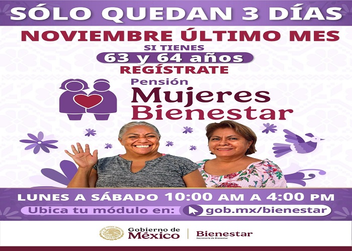 Montiel Reyes instó a las mujeres en este rango de edad a acudir a los Módulos de Bienestar de su comunidad antes del 30 de noviembre, fecha límite para el registro. Este trámite puede realizarse de lunes a sábado, de 10:00 a 16:00 horas. Para localizar el módulo más cercano, se debe consultar el sitio web de la Secretaría de Bienestar: www.gob.mx/bienestar.