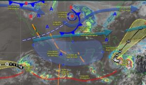 El frente frío número 10, junto con la corriente en chorro subtropical, un sistema frontal y canales...