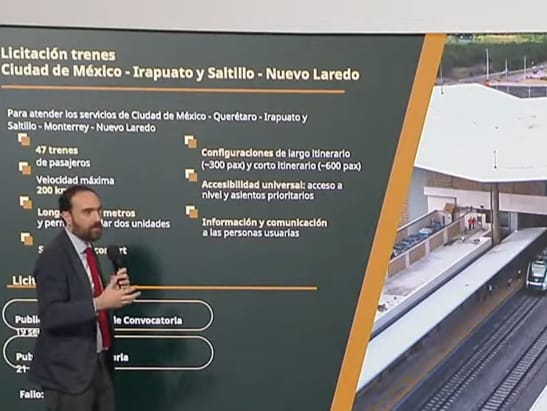 El funcionario anunció el lanzamiento de la licitación para 47 trenes que prestarán servicio en la ruta Ciudad de México–Nuevo Laredo, cuyo fallo se dará a conocer en noviembre. Agregó que los tramos Querétaro–Irapuato y Saltillo–Nuevo Laredo ya fueron licitados, mientras que la Zona Urbana de Monterrey está en proceso.