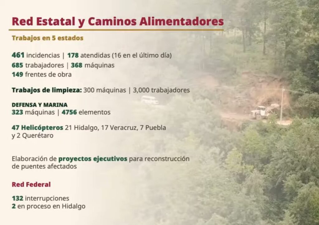 El funcionario informó que ya se liberaron las carreteras federales dañadas, y posteriormente se trabaja en la red estatal, así como en caminos alimentadores y municipales de los cinco estados más afectados. Indicó que actualmente operan 368 máquinas, además de 300 equipos y 47 helicópteros de la Marina y la Secretaría de la Defensa Nacional (Sedena), para abrir paso en las zonas más afectadas, donde incluso se han establecido puentes aéreos.