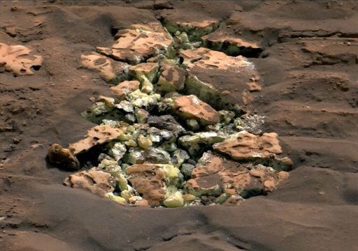 El rover Curiosity de la NASA ha descubierto cristales de azufre puro de un llamativo color verde amarillento, nunca antes vistos en Marte. Este descubrimiento, considerado revolucionario por los científicos, se produjo cuando el rover pasó sobre una pila de rocas, rompiendo accidentalmente una de ellas mientras exploraba el profundo y sinuoso canal de Gediz Vallis, formado hace 3 mil millones de años por agua.