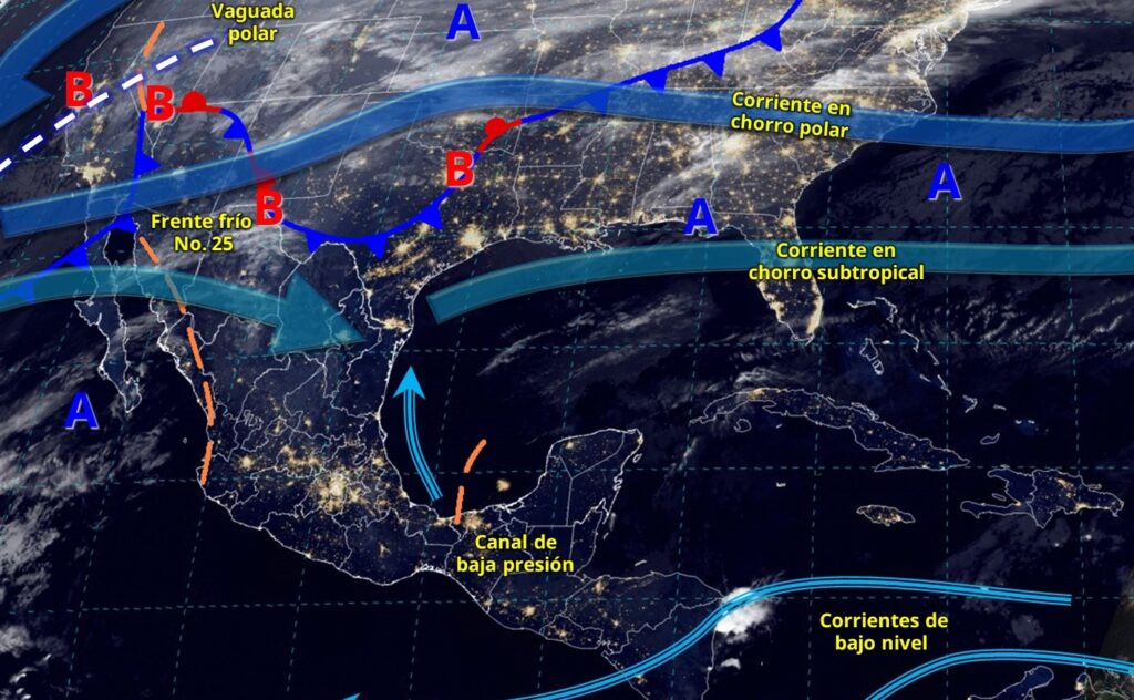 El frente frío No. 25 afectará este día el noroeste y norte del país, acompañado por una circulación ciclónica en niveles medios y altos de la atmósfera, además de la interacción con las corrientes en chorro polar y subtropical y un canal de baja presión en el noreste de México.