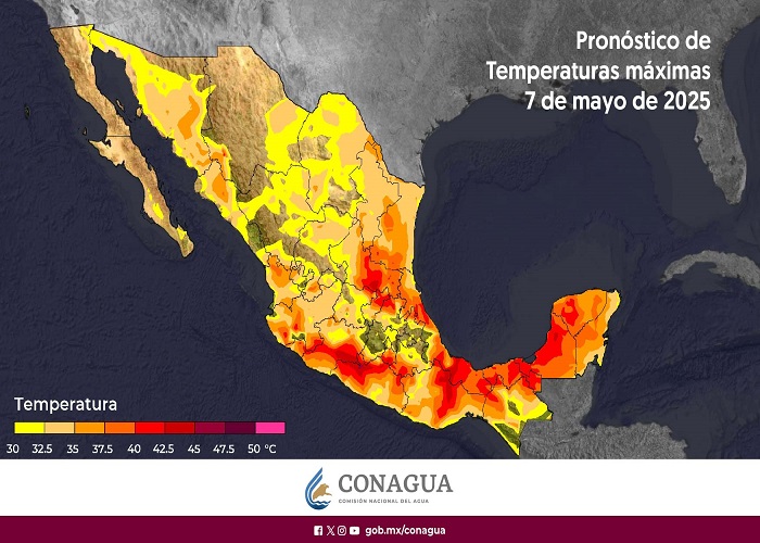 Se esperan temperaturas máximas de 40 a 45 °C: Jalisco, Colima, Michoacán, Guerrero, Oaxaca, Chiapas, Tamaulipas, San Luis Potosí, Querétaro, Hidalgo, Morelos, Puebla, Veracruz, Tabasco, Campeche y Yucatán; de 35 a 40 °C: Sonora, Chihuahua, Coahuila, Nuevo León, Zacatecas, Durango, Sinaloa, Nayarit, Aguascalientes, Guanajuato (noreste), Estado de México (suroeste) y Quintana Roo; y de 30 a 35 °C: Baja California, Baja California Sur, Ciudad de México y Tlaxcala.