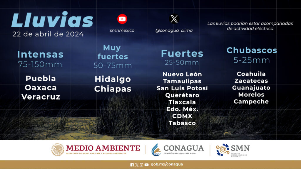 Para este día, se pronostica que el frente frío número 47, que recorrerá el oriente y sureste de México hasta la Península de Yucatán, en interacción con un canal de baja presión sobre dicha península, origine lluvias puntuales intensa en Oaxaca, Puebla y Veracruz; muy fuertes en Chiapas e Hidalgo; fuertes en Ciudad de México, Estado de México, Nuevo León, Querétaro, San Luis Potosí, Tabasco, Tamaulipas y Tlaxcala.