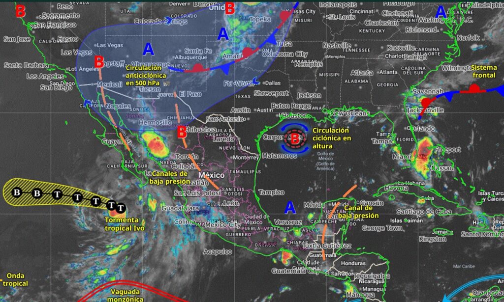 Los remanentes nubosos del ciclón tropical Ivo mantendrán la posibilidad de intervalos de chubascos y oleaje elevado en Baja California Sur. En paralelo, el monzón mexicano y la inestabilidad atmosférica favorecerán chubascos y lluvias fuertes en el noroeste del país, con precipitaciones puntuales muy fuertes en Sonora.