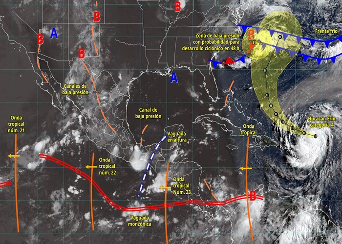 Se pronostican lluvias fuertes a muy fuertes en el noroeste del país, así como chubascos en Baja California Sur. En las regiones del norte, centro y sur se esperan chubascos y precipitaciones intensas, con probabilidad de granizadas en el occidente. De igual forma, se prevén lluvias de gran intensidad en el sureste y oriente del territorio nacional, incluyendo la Península de Yucatán.
