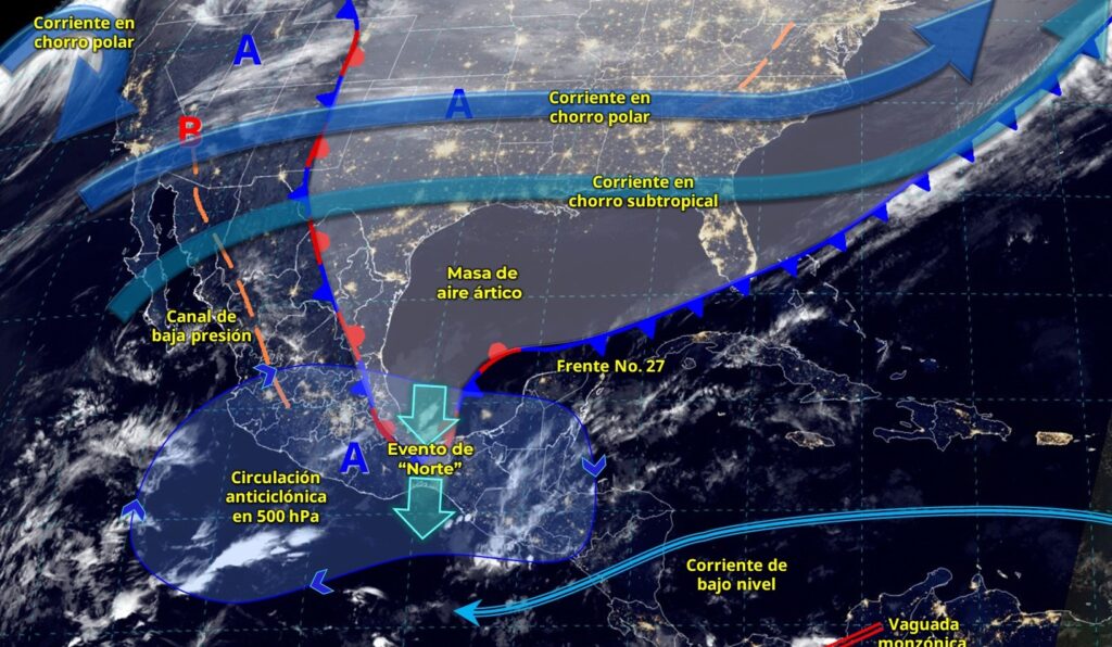 El frente No. 27 extendido con características de estacionario sobre centro y sur del golfo de México, interaccionará con un canal de baja presión en el sureste del país y ocasionará lluvias puntuales fuertes en el oriente, sur y sureste del territorio nacional, incluida la península de Yucatán; así mismo, la masa de aire ártico asociada al frente empezará a modificar sus características térmicas en el transcurso del día; sin embargo, mantendrá el evento de “Norte” con rachas de viento de 70 a 90 km/h en Veracruz (sur) e istmo y golfo de Tehuantepec, durante la mañana.