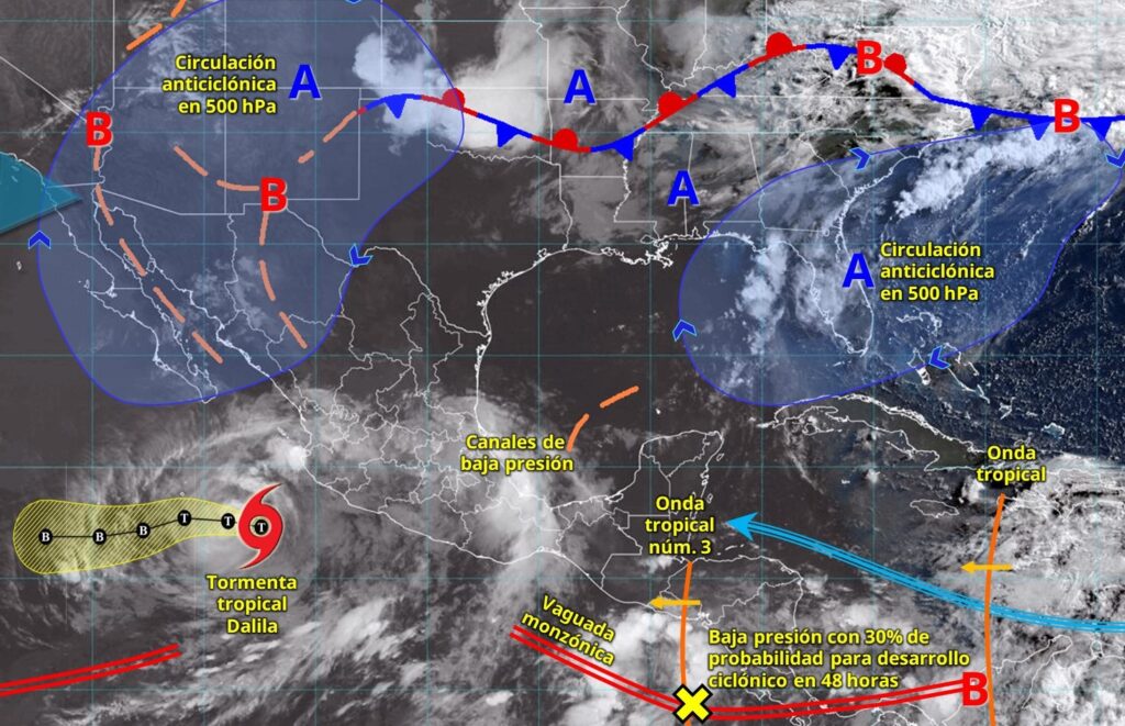 La tormenta tropical Dalila continuará su desplazamiento hacia el oeste-noroeste, alejándose poco a poco de las costas mexicanas. No obstante, su amplia circulación seguirá generando lluvias fuertes a muy fuertes en Sinaloa, Colima y Michoacán, y precipitaciones intensas en Nayarit y Jalisco. Además, se esperan vientos con rachas de 40 a 60 km/h y oleaje elevado en las costas de estas entidades, así como en la zona oriental y sur de Baja California Sur.