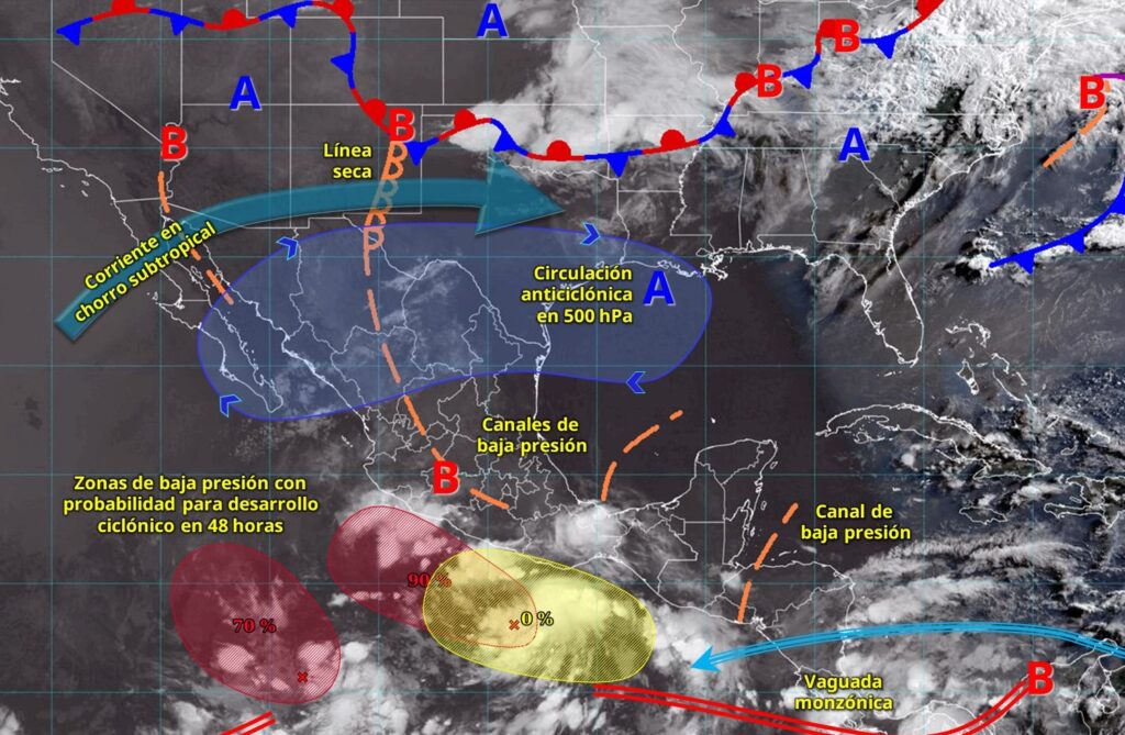 Durante este día, la circulación de una zona de baja presión con potencial para evolucionar a ciclón tropical, ubicada al sur de Guerrero, provocará lluvias muy fuertes a intensas, oleaje elevado y vientos con rachas fuertes en las entidades de Guerrero, Oaxaca y Chiapas. Asimismo, la presencia de canales de baja presión sobre la Sierra Madre Occidental, el centro y el sureste del país, en combinación con la inestabilidad atmosférica y la entrada de humedad desde el océano Pacífico y el golfo de México, originará chubascos y lluvias fuertes con descargas eléctricas en zonas del occidente, centro, oriente y sureste del país, incluyendo la península de Yucatán y el Valle de México.