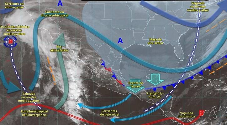 La masa ártica continuará ocasionando un evento de “norte”, con rachas de viento de 70 a 90 km/h en el Istmo y Golfo de Tehuantepec; de 50 a 70 km/h en la costa centro y sur de Veracruz, que disminuirán por la tarde; y de 40 a 60 km/h en las costas de Tabasco, Campeche, Yucatán y Quintana Roo. Estas condiciones estarán acompañadas de oleaje elevado en los litorales mencionados.
