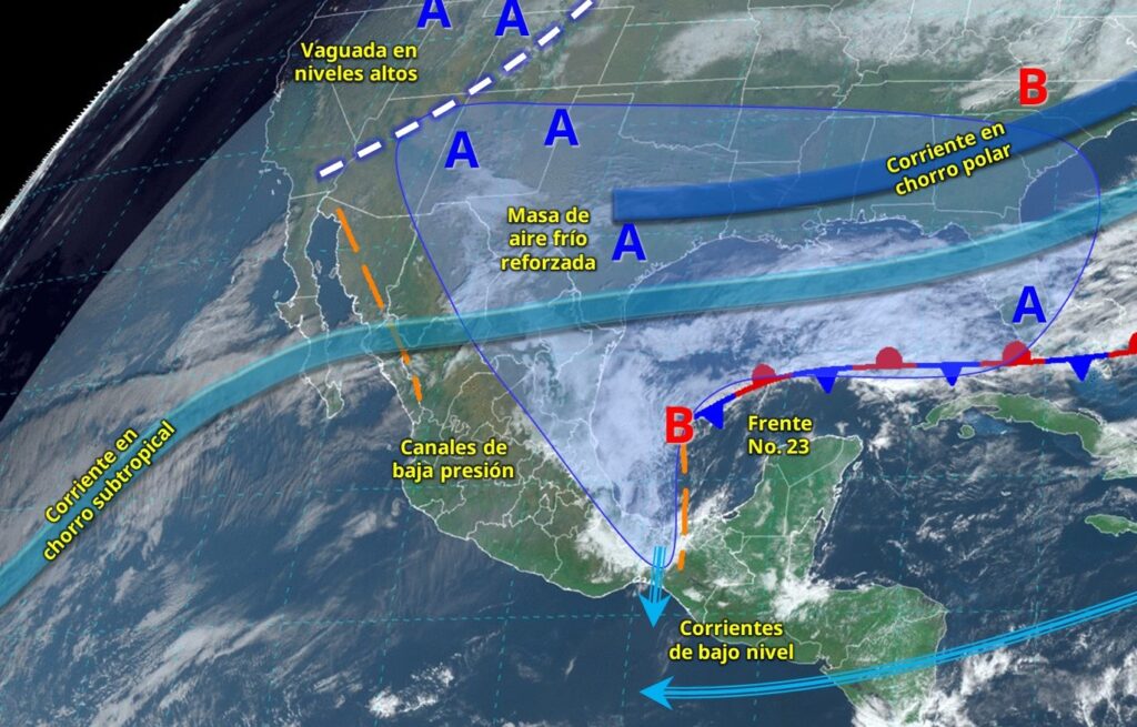 Un canal de baja presión se extenderá desde el centro del Golfo de México hasta el sureste del país, interactuando con el frente frío número 23, que se ubicará sobre el oriente de la Península de Yucatán y el mar Caribe. Esta combinación, junto con el ingreso de humedad, provocará chubascos y lluvias fuertes en dichas regiones, así como en el noreste, oriente y la Península de Yucatán.