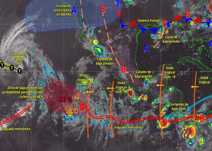 En tanto, la onda tropical núm. 18, al desplazarse por el occidente del país, interactuará con zonas de divergencia y el ingreso de humedad proveniente del océano Pacífico. Esto originará lluvias fuertes y chubascos con actividad eléctrica en el centro, sur y occidente del territorio nacional, con precipitaciones muy fuertes especialmente en Jalisco y Colima.