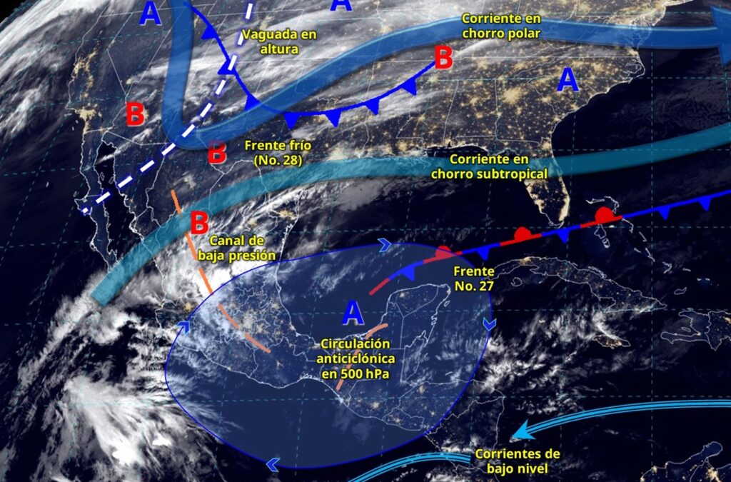Asimismo, el frente No. 27 se extenderá con características estacionario sobre el golfo de México y dejará de afectar al país. Finalmente, durante la tarde persistirá el ambiente caluroso a muy caluroso con temperaturas superiores a 35 °C en el pacífico mexicano, desde Sinaloa hasta Chiapas, así como estados del centro de México, además de Tamaulipas y San Luis Potosí.