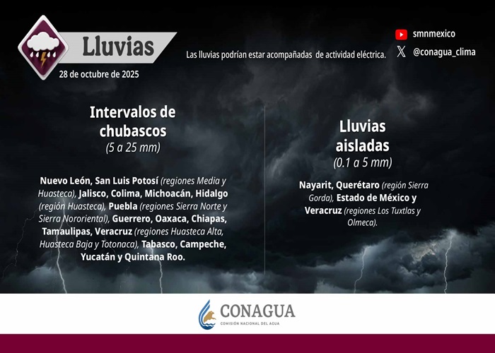 Intervalos de chubascos (5 a 25 mm): Nuevo León, Tamaulipas, San Luis Potosí, Hidalgo, Puebla, Veracruz, Tabasco, Campeche, Yucatán, Quintana Roo, Jalisco, Colima y Oaxaca.