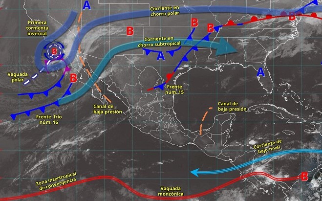 El Servicio Meteorológico Nacional (SMN) anticipa que la primera tormenta invernal de la temporada, junto con el frente frío número 16, avanzará por el noroeste y posteriormente por el norte del país. Estos sistemas provocarán chubascos, lluvias intensas, vientos fuertes y un marcado descenso de temperatura en ambas zonas, con posibilidad de caída de nieve o aguanieve en áreas montañosas de Baja California, Sonora y Chihuahua.