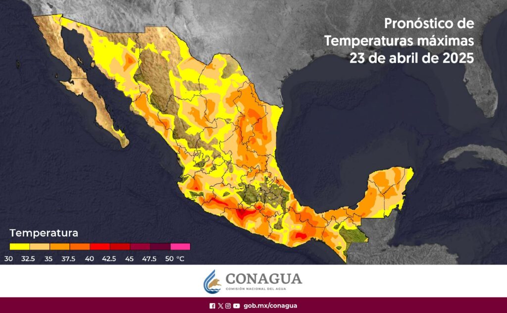 Este miércoles, una circulación anticiclónica en niveles medios de la atmósfera propiciará condiciones de calor intenso en la mayor parte del territorio nacional. Se esperan temperaturas máximas de entre 40 y 45 grados Celsius en entidades como Jalisco, Michoacán, Morelos, Guerrero y Oaxaca; de 35 a 40 grados en estados como Sonora, Sinaloa, Nayarit, Colima, Chihuahua, Coahuila, Nuevo León, entre otros; y de 30 a 35 grados en regiones de Baja California, Baja California Sur y Aguascalientes.