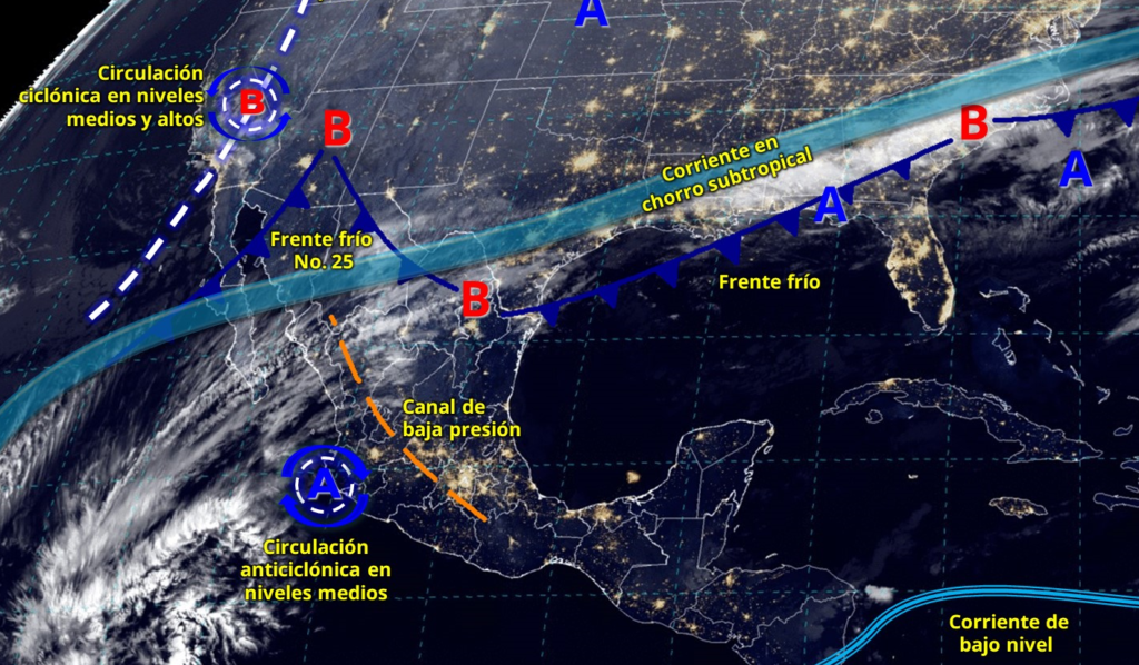 Para hoy, el frente frío No. 25 se extenderá sobre el noroeste, norte y noreste del territorio nacional y mantendrá la interacción con una circulación ciclónica en niveles medios y altos de la atmósfera y con la corriente en chorro subtropical, generando intervalos de chubascos en Baja California, Coahuila, Nuevo León y Tamaulipas; y lluvias aisladas en Sonora y San Luis Potosí.