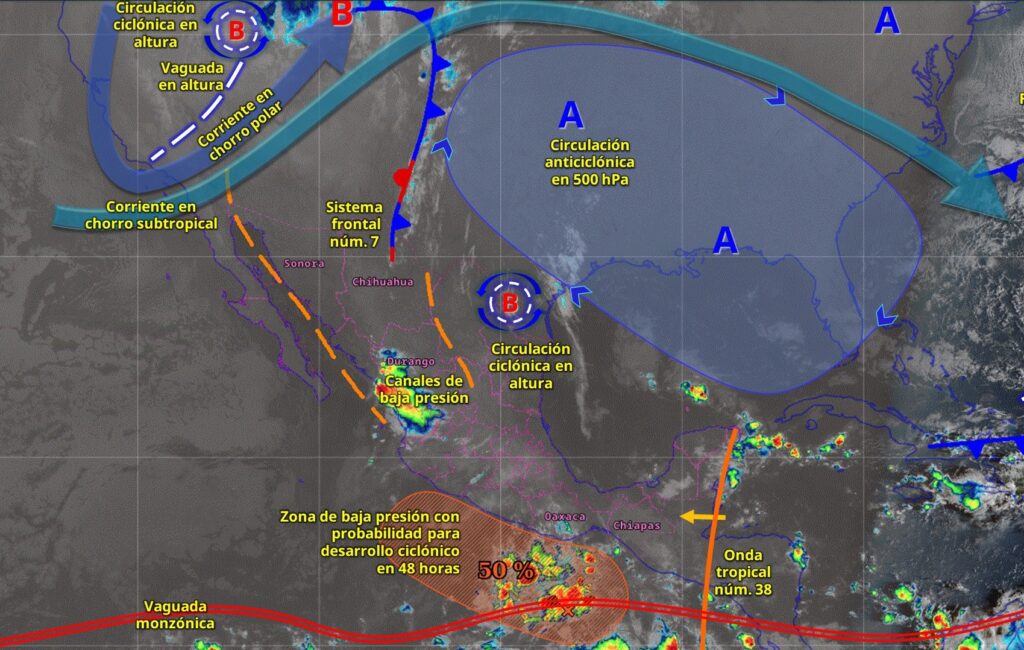 Una zona de baja presión al sur de Oaxaca, con posibilidad de convertirse en ciclón, provocará precipitaciones intensas en Chiapas y Oaxaca, muy fuertes en Guerrero y oleaje elevado en las costas del Pacífico Sur.