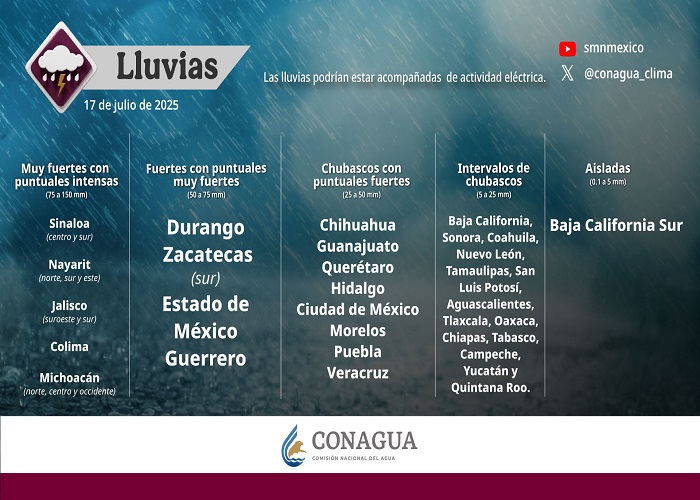 Este jueves, una circulación ciclónica en niveles altos sobre las regiones del norte y centro del país, junto con canales de baja presión, inestabilidad atmosférica y el ingreso de humedad proveniente del océano Pacífico y el golfo de México, favorecerán la presencia de lluvias de fuertes a muy fuertes, tormentas eléctricas y posibles granizadas en distintas zonas del norte, centro, occidente y sur del país. Se esperan lluvias intensas principalmente en Jalisco, Colima y Michoacán. Además, el monzón mexicano provocará precipitaciones igualmente intensas en Sinaloa y Nayarit, así como lluvias fuertes a muy fuertes en Chihuahua y Durango. También se pronostican chubascos en Baja California y lluvias aisladas en Baja California Sur.