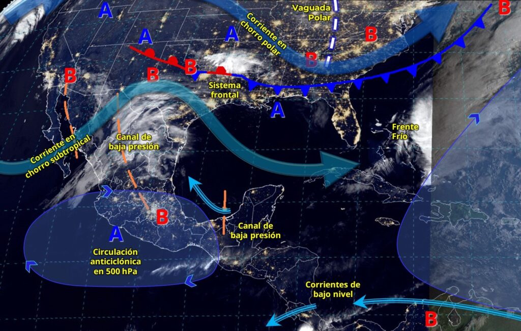 Este miércoles, la combinación de un canal de baja presión con la proximidad de un sistema frontal en el norte y noreste del país, junto con inestabilidad atmosférica en niveles altos, provocará lluvias intensas con actividad eléctrica y posible granizo en Coahuila, Nuevo León y Tamaulipas. Además, se prevén vientos fuertes y la posible aparición de torbellinos o tornados en el norte de estas entidades.