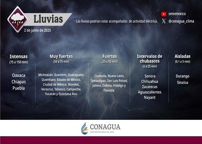 Estas precipitaciones estarán acompañadas de tormentas eléctricas, vientos fuertes, posible caída de granizo, así como riesgo de encharcamientos, inundaciones, deslaves e incremento en niveles de ríos y arroyos.