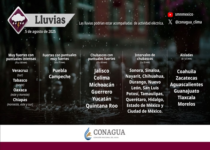 Chubascos (5 a 25 mm): Sonora, Sinaloa, Nayarit, Chihuahua, Durango, Nuevo León, San Luis Potosí, Tamaulipas, Querétaro, Hidalgo, Estado de México y Ciudad de México.