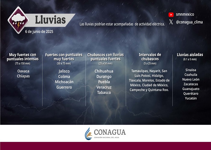 Es así que se esperan lluvias intensas en Oaxaca y Chiapas; muy fuertes en Jalisco, Colima, Michoacán y Guerrero; fuertes rn Chihuahua, Durango, Puebla, Veracruz y Tabasco; y chubascos en Tamaulipas, Nayarit, San Luis Potosí, Hidalgo, Tlaxcala, Morelos, Estado de México, Ciudad de México, Campeche y Quintana Roo.
