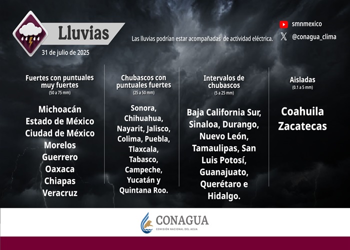 Se anticipan lluvias de fuertes a muy fuertes en el sur, sureste y la península de Yucatán, debido a la interacción del monzón mexicano con otros sistemas climáticos. Estas condiciones también provocarán precipitaciones intensas acompañadas de tormentas eléctricas en el noroeste del país.