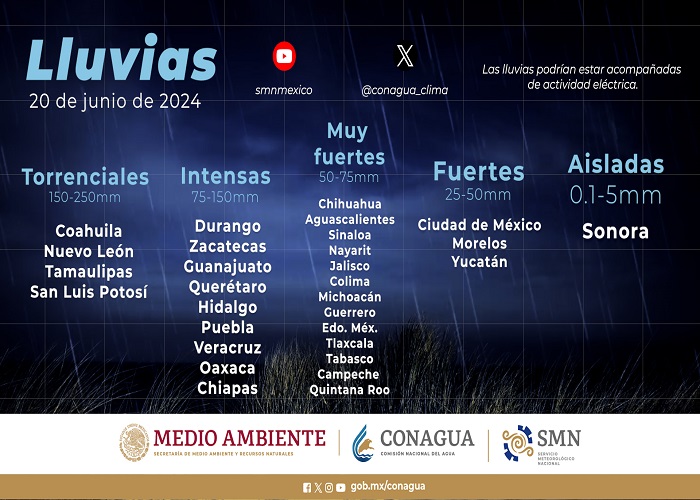 Las precipitaciones podrían ser con descargas eléctricas y granizo; asimismo, pueden generar deslaves, incremento en niveles de ríos y arroyos, así como desbordamientos e inundaciones en zonas de los estados mencionados, por lo que se exhorta a la población, a los turistas y a la navegación marítima, a atender los avisos del Servicio Meteorológico Nacional (SMN), de la Comisión Nacional del Agua (Conagua), seguir las recomendaciones de Protección Civil y extremar precauciones ante las condiciones de lluvia, viento y oleaje elevado.