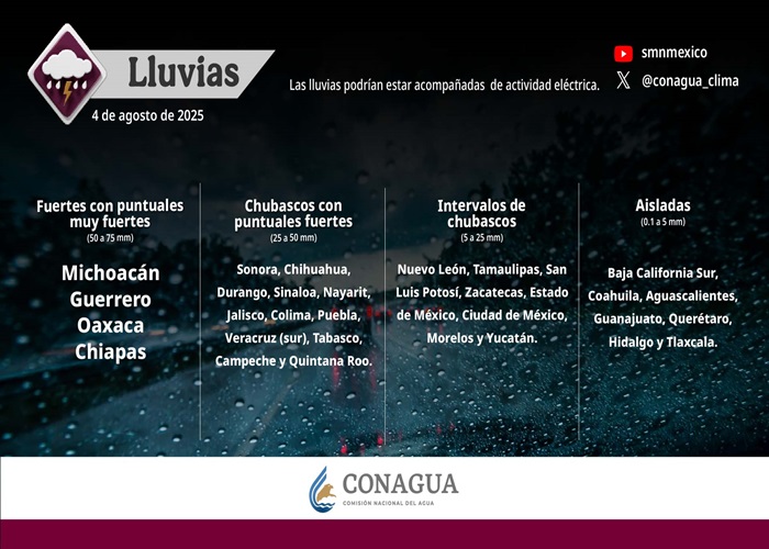 Asimismo, un canal de baja presión y el ingreso de humedad del Golfo de México ocasionarán lluvias y chubascos en regiones del norte, noreste, occidente, centro y oriente del país. En estados como Jalisco, Colima, Puebla, Michoacán y Guerrero, las precipitaciones podrían ser de fuertes a muy fuertes. En el sureste, otro canal de baja presión, combinado con la llegada de la onda tropical número 20 a la península de Yucatán, generará chubascos y lluvias intensas con descargas eléctricas en la zona.