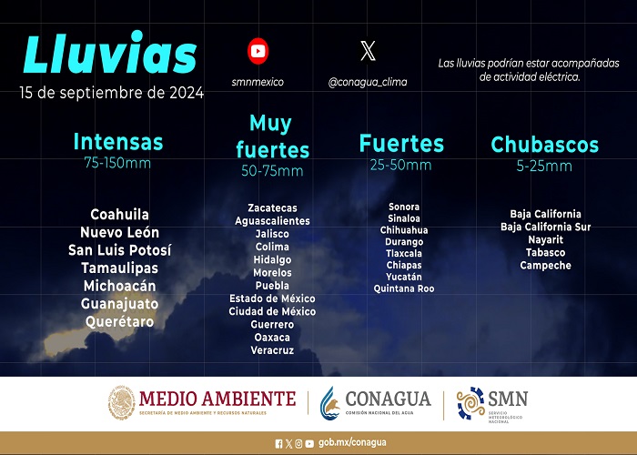 Para este domingo, se pronostican lluvias intensas en Coahuila, Guanajuato, Michoacán, Nuevo León, Querétaro, San Luis Potosí y Tamaulipas; muy fuertes en Aguascalientes, Ciudad de México, Colima, Estado de México, Guerrero, Hidalgo, Jalisco, Morelos, Oaxaca, Puebla, Veracruz y Zacatecas; fuertes en Chiapas, Chihuahua, Durango, Quintana Roo, Sinaloa, Sonora, Tlaxcala y Yucatán, e intervalos de chubascos en Baja California, Baja California Sur, Campeche, Nayarit y Tabasco.