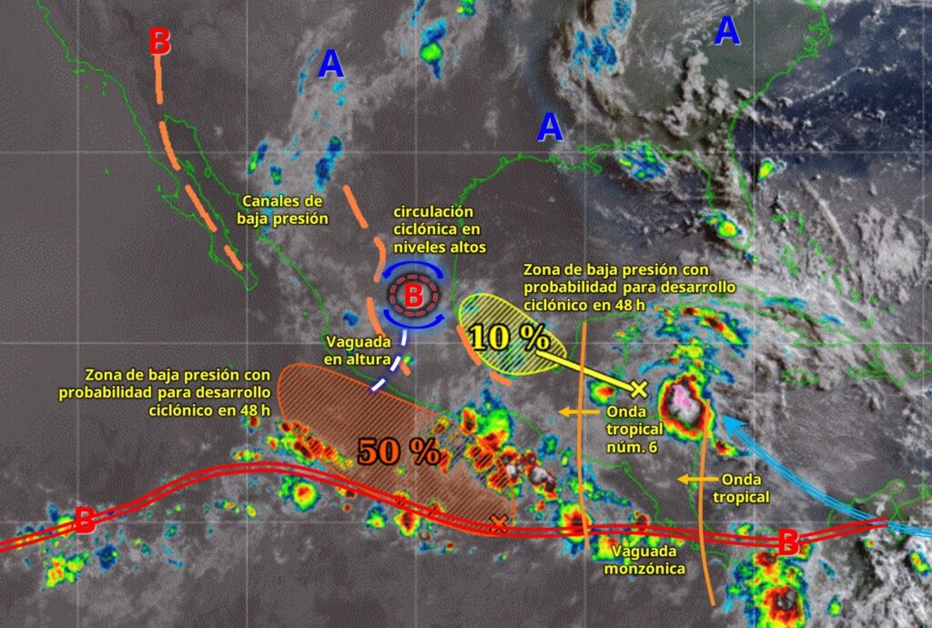 Durante este día, la onda tropical número 6 será absorbida por una zona de baja presión con potencial de desarrollo ciclónico en el océano Pacífico. Este sistema se desplazará frente a las costas de Oaxaca y Chiapas, donde interactuará con un canal de baja presión en el sureste del país. A esto se suma el ingreso de humedad proveniente del Pacífico, el golfo de México y el mar Caribe, así como la cercanía de una nueva onda tropical a la península de Yucatán, lo cual favorecerá la presencia de lluvias intensas en regiones de Veracruz, Oaxaca, Chiapas, Tabasco, Campeche y Quintana Roo, además de precipitaciones muy fuertes en Yucatán.