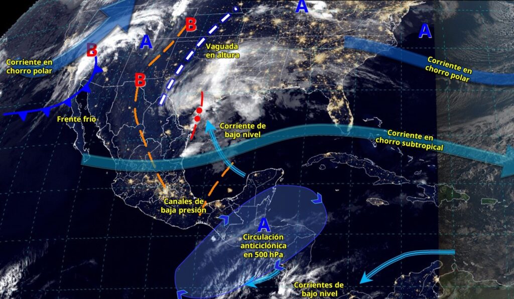 Hoy viernes, un canal de baja presión sobre el noreste de México, en interacción con la corriente en chorro subtropical, el ingreso de humedad del golfo de México, y con una línea seca que se establecerá sobre Coahuila, ocasionarán lluvias y chubascos en Nuevo León, San Luis Potosí, Veracruz y Puebla, con lluvias puntuales fuertes en Tamaulipas, donde existe la probabilidad de formación de torbellinos.