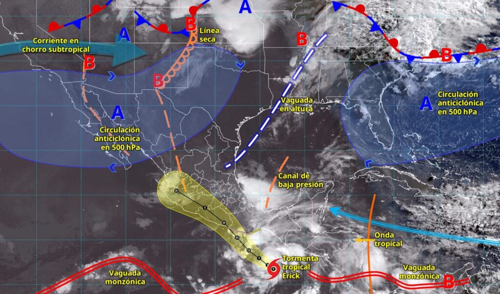 Durante este día, la tormenta tropical Erik se localizará al sur de las costas de Chiapas; en combinación con un canal de baja presión en el sureste del país, la aproximación de una onda tropical y la entrada de humedad del mar Caribe, propiciarán lluvias fuertes a puntuales muy fuertes en dicha región y la península de Yucatán; pronosticándose lluvias puntuales intensas en Guerrero, Oaxaca, Chiapas y Veracruz, así como rachas muy fuertes de viento y oleaje elevado en las costas del sur y sureste del territorio nacional.