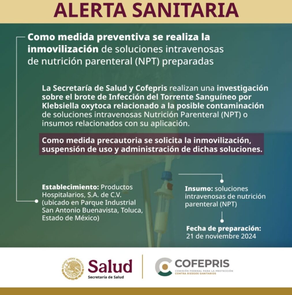 La Comisión Federal para la Protección contra Riesgos Sanitarios (Cofepris) anunció la suspensión del uso de soluciones intravenosas de Nutrición Parenteral Total (NPT) elaboradas desde el 21 de noviembre de 2024, debido a un brote de Infección del Torrente Sanguíneo (ITS) causado por Klebsiella oxytoca multidrogo resistente.