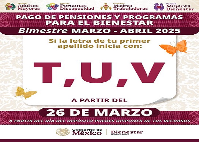 Las personas cuyo primer apellido inicie con la letras T, U, V podrán acceder a los recursos de los programas Pensiones para el Bienestar y Madres Trabajadoras, correspondientes al bimestre marzo-abril.