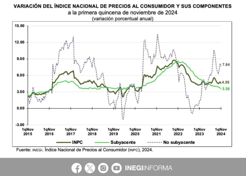 La inflación en México alcanzó una tasa anual de 4.56% en la primera quincena de noviembre, una cifra menor al 4.83% registrado en la segunda mitad de octubre, según datos del Instituto Nacional de Estadística y Geografía (Inegi).