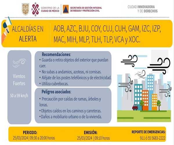 La Secretaría de Gestión Integral de Riesgos y Protección Civil (SGIRPC) activó la alerta amarilla por fuertes vientos en la Ciudad de México.