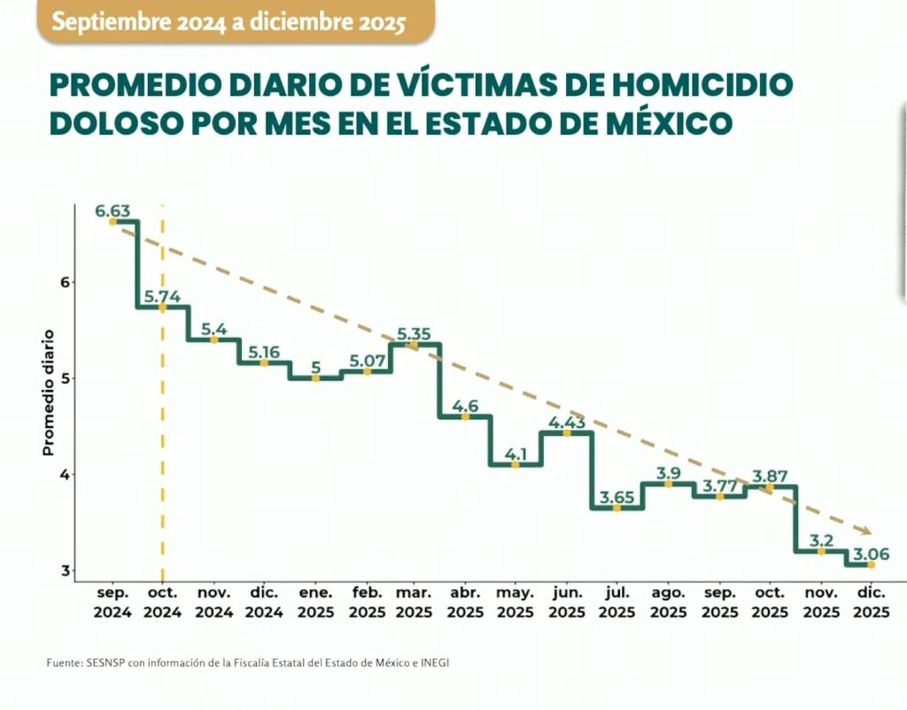 Entre septiembre de 2024 y diciembre de 2025, el Estado de México registró una disminución del 54% en el delito de homicidio doloso, informó la titular del Secretariado Ejecutivo del Sistema Nacional de Seguridad Pública, Marcela Figueroa Franco. Durante la conferencia matutina de la presidenta Claudia Sheinbaum, realizada en Ecatepec, la funcionaria detalló que la tasa pasó de 6.63 casos en septiembre de 2024 a 3.06 en diciembre de 2025, cifra que convirtió a diciembre del año pasado en el mes con menos víctimas y el nivel más bajo en los últimos 11 años.