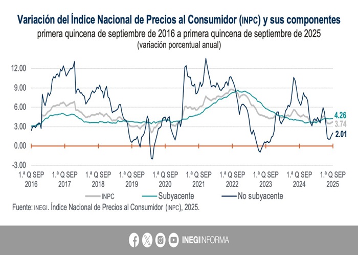 El Instituto Nacional de Estadística y Geografía (INEGI) reportó que el Índice Nacional de Precios al Consumidor (INPC) alcanzó un 3.74% anual, ligeramente por arriba del 3.65% registrado en la segunda mitad de agosto. Analistas consultados por Reuters esperaban un 3.77%.