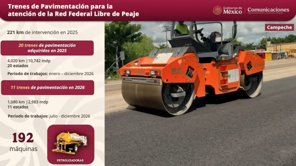 Para cumplir con los objetivos, la dependencia informó que ya se adquirieron 20 trenes de pavimentación; de estos, 10 ya están en operación y el resto comenzará a trabajar entre enero y febrero. También se prevé la compra de 11 equipos adicionales para reforzar las acciones en los estados.