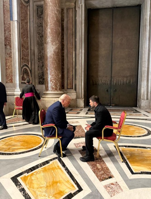 Poco antes del funeral del papa Francisco este sábado, se pudo observar al presidente de Estados Unidos, Donald Trump, y al mandatario ucraniano, Volodymyr Zelensky, dentro de la Basílica de San Pedro.